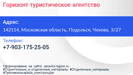 Горизонт, туристическое агентство по адресу 142114, Московская область, Подольск, Чехова, 3/27 в дальнейшем Организация, размещена в следующих категориях: