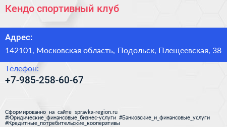 Кендо, спортивный клуб по адресу 142101, Московская область, Подольск, Плещеевская, 38 в дальнейшем Организация, размещена в следующих категориях: