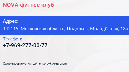 NOVA, фитнес-клуб по адресу 142115, Московская область, Подольск, Молодёжная, 13а в дальнейшем Организация, размещена в следующих категориях: