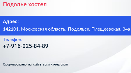 Подолье, хостел по адресу 142101, Московская область, Подольск, Плещеевская, 34а в дальнейшем Организация, размещена в следующих категориях:
