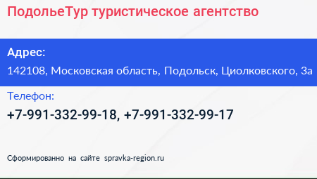 ПодольеТур, туристическое агентство по адресу 142108, Московская область, Подольск, Циолковского, 3а в дальнейшем Организация, размещена в следующих категориях: