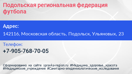 Подольская региональная федерация футбола по адресу 142116, Московская область, Подольск, Ульяновых, 23 в дальнейшем Организация, размещена в следующих категориях: