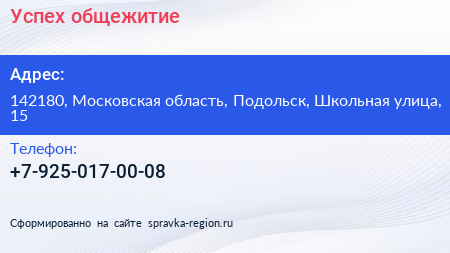 Успех, общежитие по адресу 142180, Московская область, Подольск, Школьная улица, 15 в дальнейшем Организация, размещена в следующих категориях: