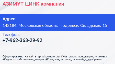 АЗИМУТ ЦИНК, компания по адресу 142184, Московская область, Подольск, Складская, 15 в дальнейшем Организация, размещена в следующих категориях: