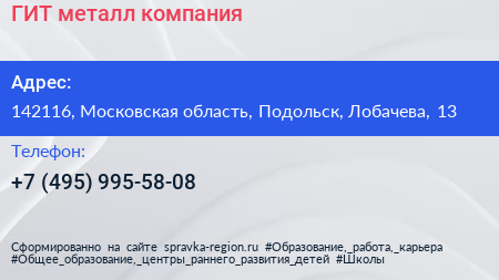 ГИТ металл, компания по адресу 142116, Московская область, Подольск, Лобачева, 13 в дальнейшем Организация, размещена в следующих категориях: