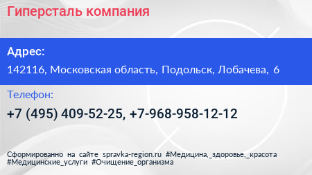 Гиперсталь, компания по адресу 142116, Московская область, Подольск, Лобачева, 6 в дальнейшем Организация, размещена в следующих категориях: