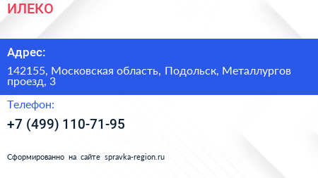 ИЛЕКО по адресу 142155, Московская область, Подольск, Металлургов проезд, 3 в дальнейшем Организация, размещена в следующих категориях: