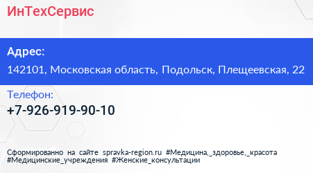 ИнТехСервис по адресу 142101, Московская область, Подольск, Плещеевская, 22 в дальнейшем Организация, размещена в следующих категориях: