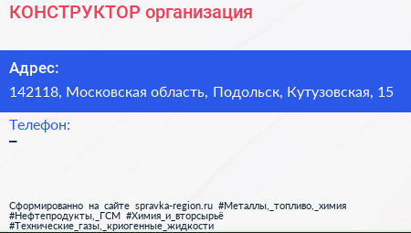 КОНСТРУКТОР, организация по адресу 142118, Московская область, Подольск, Кутузовская, 15 в дальнейшем Организация, размещена в следующих категориях: