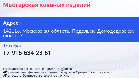 Мастерская кованых изделий по адресу 142116, Московская область, Подольск, Домодедовское шоссе, 7 в дальнейшем Организация, размещена в следующих категориях: