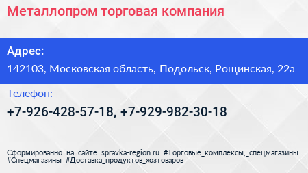 Металлопром, торговая компания по адресу 142103, Московская область, Подольск, Рощинская, 22а в дальнейшем Организация, размещена в следующих категориях: