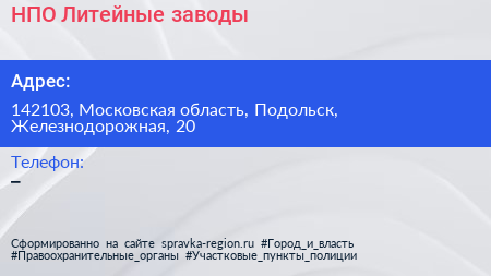 НПО Литейные заводы по адресу 142103, Московская область, Подольск, Железнодорожная, 20 в дальнейшем Организация, размещена в следующих категориях: