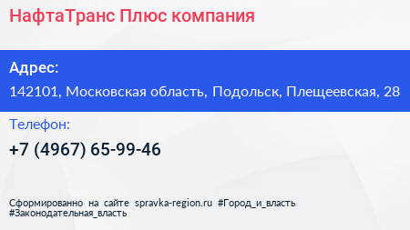 НафтаТранс Плюс, компания по адресу 142101, Московская область, Подольск, Плещеевская, 28 в дальнейшем Организация, размещена в следующих категориях:
