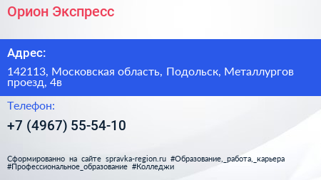 Орион Экспресс по адресу 142113, Московская область, Подольск, Металлургов проезд, 4в в дальнейшем Организация, размещена в следующих категориях: