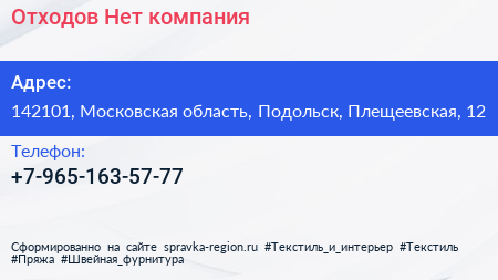 Отходов Нет, компания по адресу 142101, Московская область, Подольск, Плещеевская, 12 в дальнейшем Организация, размещена в следующих категориях: