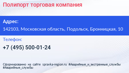 Полипорт, торговая компания по адресу 142103, Московская область, Подольск, Бронницкая, 10 в дальнейшем Организация, размещена в следующих категориях: