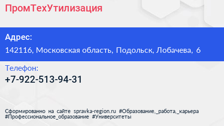 ПромТехУтилизация по адресу 142116, Московская область, Подольск, Лобачева, 6 в дальнейшем Организация, размещена в следующих категориях: