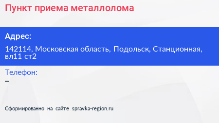 Пункт приема металлолома по адресу 142114, Московская область, Подольск, Станционная, вл11 ст2 в дальнейшем Организация, размещена в следующих категориях: