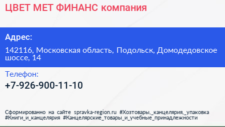 ЦВЕТ МЕТ ФИНАНС, компания по адресу 142116, Московская область, Подольск, Домодедовское шоссе, 14 в дальнейшем Организация, размещена в следующих категориях: