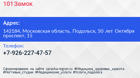 101 Замок по адресу 142184, Московская область, Подольск, 50 лет Октября проспект, 15 в дальнейшем Организация, размещена в следующих категориях: