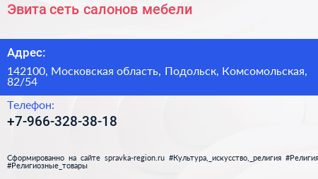 Эвита, сеть салонов мебели по адресу 142100, Московская область, Подольск, Комсомольская, 82/54 в дальнейшем Организация, размещена в следующих категориях: