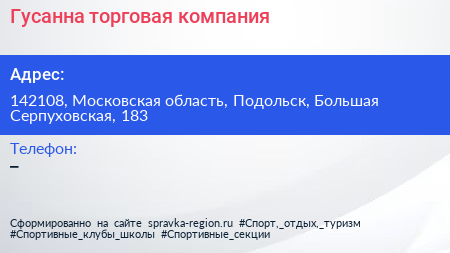 Гусанна, торговая компания по адресу 142108, Московская область, Подольск, Большая Серпуховская, 183 в дальнейшем Организация, размещена в следующих категориях: