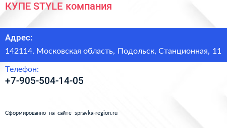 КУПЕ STYLE, компания по адресу 142114, Московская область, Подольск, Станционная, 11 в дальнейшем Организация, размещена в следующих категориях: