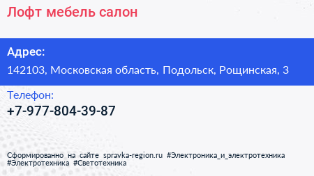 Лофт мебель, салон по адресу 142103, Московская область, Подольск, Рощинская, 3 в дальнейшем Организация, размещена в следующих категориях:
