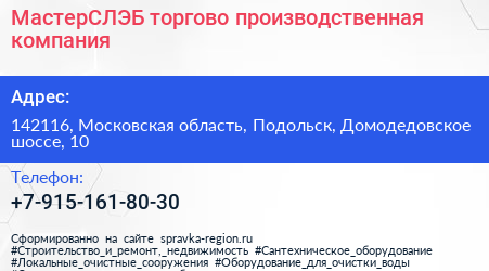 МастерСЛЭБ, торгово-производственная компания по адресу 142116, Московская область, Подольск, Домодедовское шоссе, 10 в дальнейшем Организация, размещена в следующих категориях:
