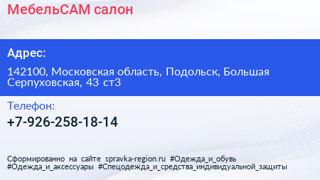 МебельСАМ, салон по адресу 142100, Московская область, Подольск, Большая Серпуховская, 43 ст3 в дальнейшем Организация, размещена в следующих категориях: