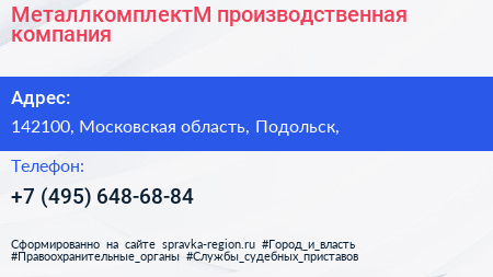 МеталлкомплектМ, производственная компания по адресу 142100, Московская область, Подольск, в дальнейшем Организация, размещена в следующих категориях: