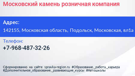 Московский камень, розничная компания по адресу 142155, Московская область, Подольск, Московская, вл1а в дальнейшем Организация, размещена в следующих категориях: