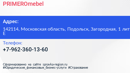 PRIMEROmebel по адресу 142114, Московская область, Подольск, Загородная, 1 лит Е в дальнейшем Организация, размещена в следующих категориях: