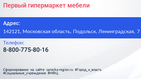 Первый гипермаркет мебели по адресу 142121, Московская область, Подольск, Ленинградская, 7 в дальнейшем Организация, размещена в следующих категориях: