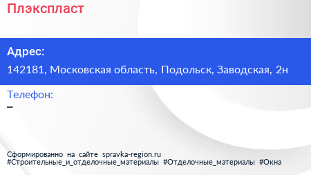 Плэкспласт по адресу 142181, Московская область, Подольск, Заводская, 2н в дальнейшем Организация, размещена в следующих категориях: