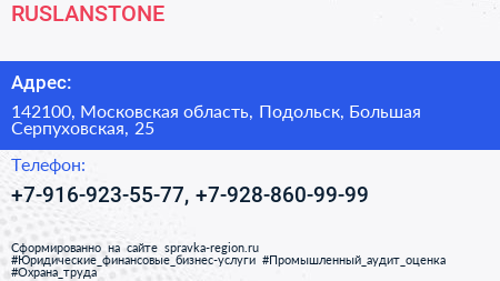 RUSLANSTONE по адресу 142100, Московская область, Подольск, Большая Серпуховская, 25 в дальнейшем Организация, размещена в следующих категориях: