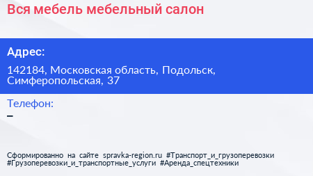 Вся мебель, мебельный салон по адресу 142184, Московская область, Подольск, Симферопольская, 37 в дальнейшем Организация, размещена в следующих категориях: