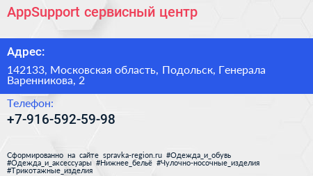 AppSupport, сервисный центр по адресу 142133, Московская область, Подольск, Генерала Варенникова, 2 в дальнейшем Организация, размещена в следующих категориях: