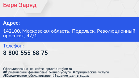 Бери Заряд! по адресу 142100, Московская область, Подольск, Революционный проспект, 47/1 в дальнейшем Организация, размещена в следующих категориях: