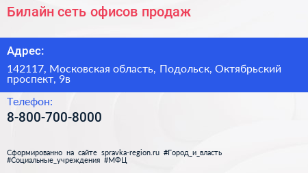 Билайн, сеть офисов продаж по адресу 142117, Московская область, Подольск, Октябрьский проспект, 9в в дальнейшем Организация, размещена в следующих категориях: