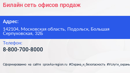 Билайн, сеть офисов продаж по адресу 142104, Московская область, Подольск, Большая Серпуховская, 32Б в дальнейшем Организация, размещена в следующих категориях: