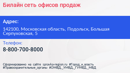 Билайн, сеть офисов продаж по адресу 142100, Московская область, Подольск, Большая Серпуховская, 5 в дальнейшем Организация, размещена в следующих категориях: