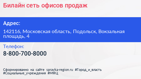 Билайн, сеть офисов продаж по адресу 142116, Московская область, Подольск, Вокзальная площадь, 4 в дальнейшем Организация, размещена в следующих категориях: