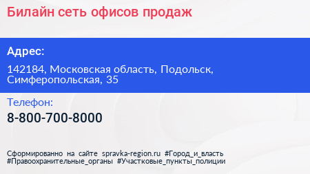 Билайн, сеть офисов продаж по адресу 142184, Московская область, Подольск, Симферопольская, 35 в дальнейшем Организация, размещена в следующих категориях: