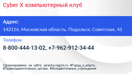 Cyber X, компьютерный клуб по адресу 142116, Московская область, Подольск, Советская, 41 в дальнейшем Организация, размещена в следующих категориях: