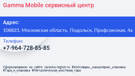 Gamma-Mobile, сервисный-центр по адресу 108823, Московская область, Подольск, Профсоюзная, 4а в дальнейшем Организация, размещена в следующих категориях: