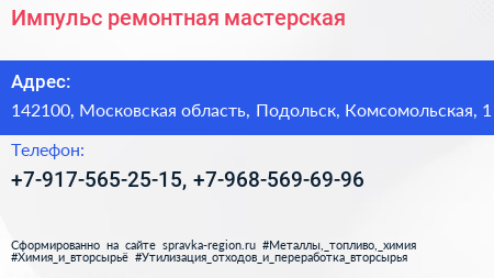 Импульс, ремонтная мастерская по адресу 142100, Московская область, Подольск, Комсомольская, 1 в дальнейшем Организация, размещена в следующих категориях: