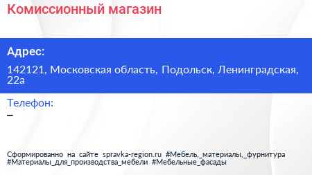 Комиссионный магазин по адресу 142121, Московская область, Подольск, Ленинградская, 22а в дальнейшем Организация, размещена в следующих категориях: