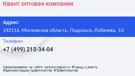 Квант, оптовая компания по адресу 142116, Московская область, Подольск, Лобачева, 13 в дальнейшем Организация, размещена в следующих категориях: