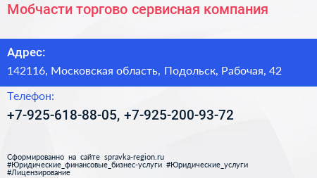 Мобчасти, торгово-сервисная компания по адресу 142116, Московская область, Подольск, Рабочая, 42 в дальнейшем Организация, размещена в следующих категориях: